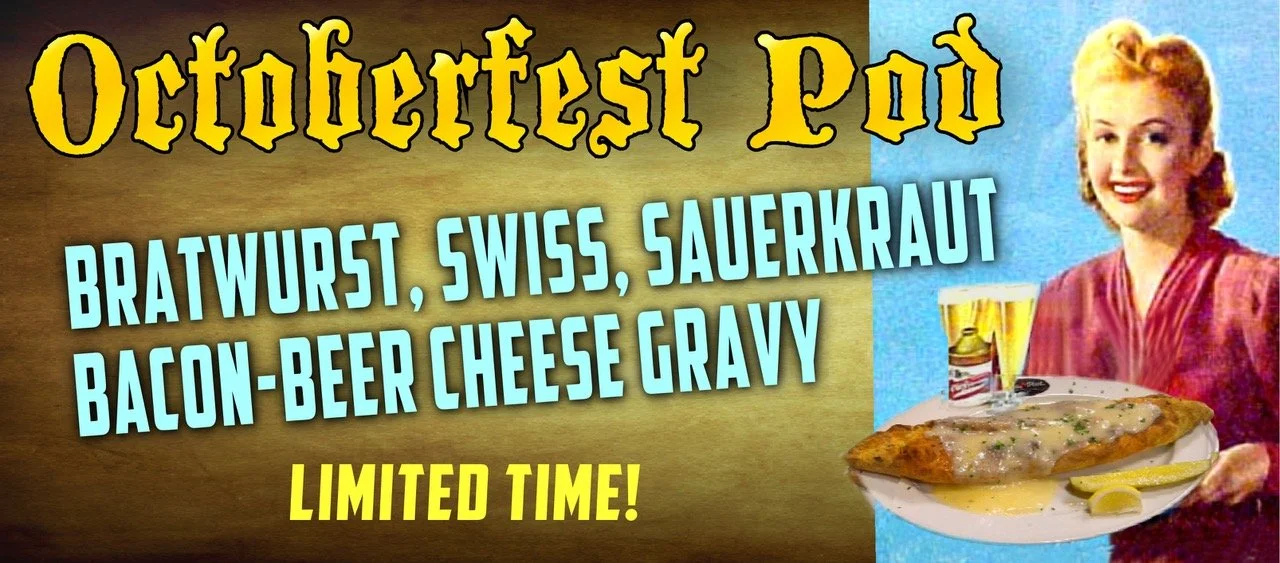 OCTOBERFEST POD A plump bratwurst, shredded swiss, sauerkraut, bacon, and lemon wine gravy. Available from September to October.